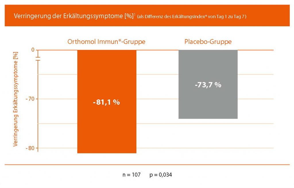 Dieser erhöhte Bedarf kann gezielt mit der Kombination aus Vitaminen, Spuren-elementen und sekundären Pflanzenstoffen in Orthomol Immun® ausgeglichen werden. Das bestätigen unter anderem die Ergebnisse einer randomisierten Doppelblindstudie mit 192 Patienten4. Bei täglicher Einnahme von Orthomol Immun® über 16 Wochen täglich, reduzierten sich die Erkältungssymptome versus Placebo signifikant (p = 0,043). Zudem kam es zu einer ebenfalls signifikanten Verbesserung der Symptome bei den Studienteilnehmern, die am ersten Erkältungstag mindestens zwei erkältungstypische Symptome aufwiesen (p = 0,034). Die Einnahme der ergänzend bilanzierten Diät wirkte sich auch positiv auf den Krankenstand aus: Besonders in der Altersgruppe unter 45 Jahre wurden Patienten der Verum-Gruppe während der zweiten oder dritten Erkältungsperiode seltener krankgeschrieben als Teilnehmer der Placebo-Gruppe (14,3 % vs. 47,8 %; p = 0,038).